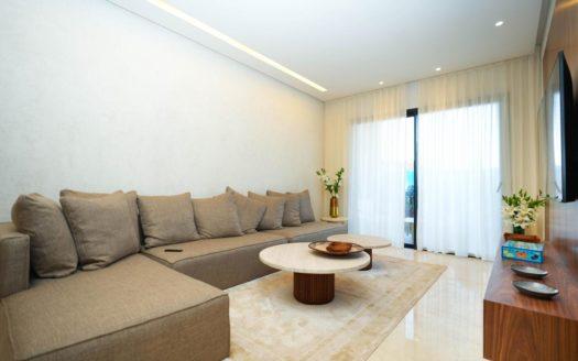 L’appartement dégage une ambiance cozy, parfaite pour une résidence principale ou un pied-à-terre élégant à Marrakech. Il comprend un salon lumineux, deux chambres confortables avec rangements, une cuisine moderne entièrement équipée ainsi qu’une salle de bain raffinée.
