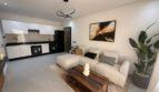 Le salon est ouvert sur la cuisine américaine, dans un espace de vie convivial, avec un mur décoratif en bois et un emplacement mural pour TV.